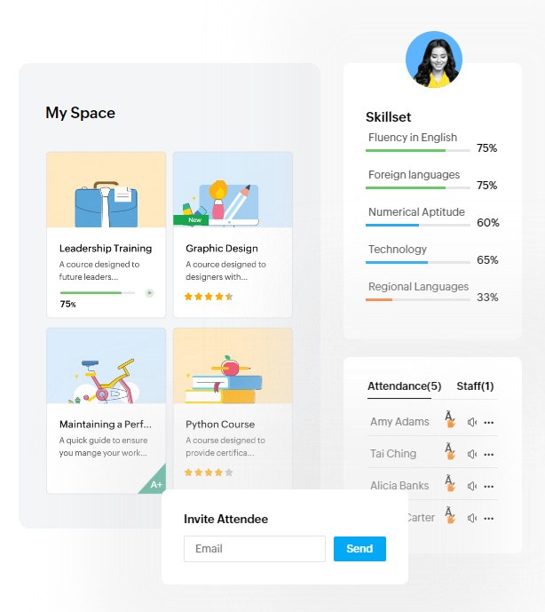 在 Zoho People 的帮助下,您可以有效地管理您的员工并为他们提供最好的学习环境。我们的学习和发展系统中的每个团队都通过有趣的材料和在线培训获得动态学习。